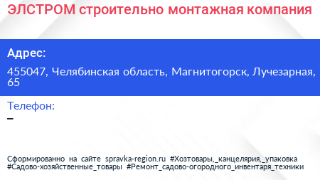 ЭЛСТРОМ, строительно-монтажная компания по адресу 455047, Челябинская область, Магнитогорск, Лучезарная, 65 в дальнейшем Организация, размещена в следующих категориях: