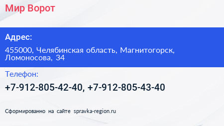 Мир Ворот по адресу 455000, Челябинская область, Магнитогорск, Ломоносова, 34 в дальнейшем Организация, размещена в следующих категориях: