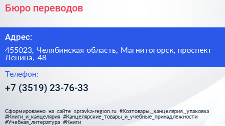 Бюро переводов по адресу 455023, Челябинская область, Магнитогорск, проспект Ленина, 48 в дальнейшем Организация, размещена в следующих категориях: