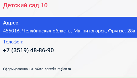 Детский сад №10 по адресу 455016, Челябинская область, Магнитогорск, Фрунзе, 28а в дальнейшем Организация, размещена в следующих категориях: