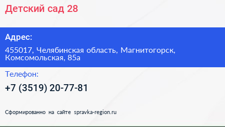 Детский сад №28 по адресу 455017, Челябинская область, Магнитогорск, Комсомольская, 85а в дальнейшем Организация, размещена в следующих категориях: