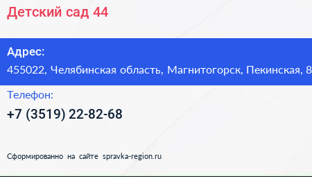 Детский сад №44 по адресу 455022, Челябинская область, Магнитогорск, Пекинская, 8 в дальнейшем Организация, размещена в следующих категориях: