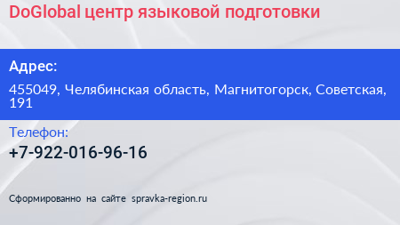 DoGlobal, центр языковой подготовки по адресу 455049, Челябинская область, Магнитогорск, Советская, 191 в дальнейшем Организация, размещена в следующих категориях: