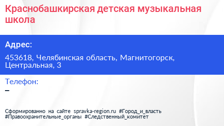 Краснобашкирская детская музыкальная школа по адресу 453618, Челябинская область, Магнитогорск, Центральная, 3 в дальнейшем Организация, размещена в следующих категориях: