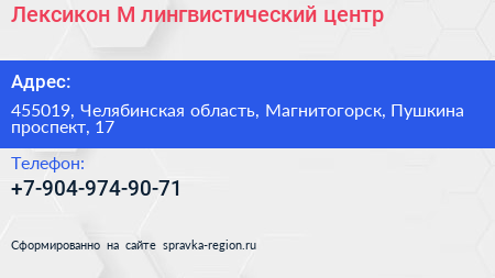 Лексикон-М, лингвистический центр по адресу 455019, Челябинская область, Магнитогорск, Пушкина проспект, 17 в дальнейшем Организация, размещена в следующих категориях: