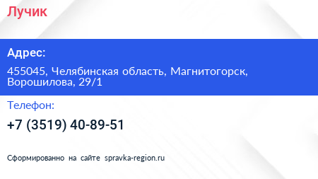 Лучик по адресу 455045, Челябинская область, Магнитогорск, Ворошилова, 29/1 в дальнейшем Организация, размещена в следующих категориях: