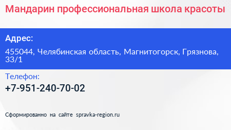 Мандарин, профессиональная школа красоты по адресу 455044, Челябинская область, Магнитогорск, Грязнова, 33/1 в дальнейшем Организация, размещена в следующих категориях: