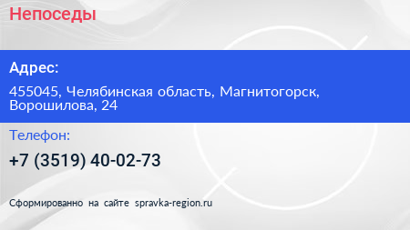 Для связи с организацией воспользуйтесь номером телефона: +7 (3519) 40-02-73. Пн: c 07:00-19:00, Вт: c 07:00-19:00, Ср: c 07:00-19:00, Чт: c 07:00-19:00, Пт: c 07:00-19:00, Сб: выходной, Вс: выходной, вы можете обратиться в эту организацию.
