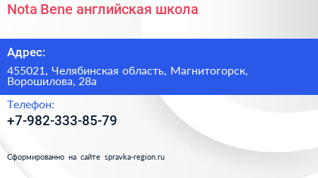 Nota Bene, английская школа по адресу 455021, Челябинская область, Магнитогорск, Ворошилова, 28а в дальнейшем Организация, размещена в следующих категориях: