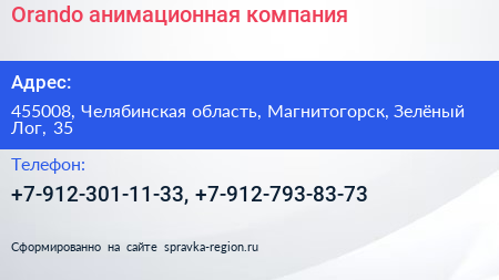 Orando, анимационная компания по адресу 455008, Челябинская область, Магнитогорск, Зелёный Лог, 35 в дальнейшем Организация, размещена в следующих категориях: