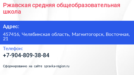 Ржавская средняя общеобразовательная школа по адресу 457416, Челябинская область, Магнитогорск, Восточная, 21 в дальнейшем Организация, размещена в следующих категориях: