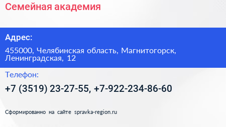 Семейная академия по адресу 455000, Челябинская область, Магнитогорск, Ленинградская, 12 в дальнейшем Организация, размещена в следующих категориях: