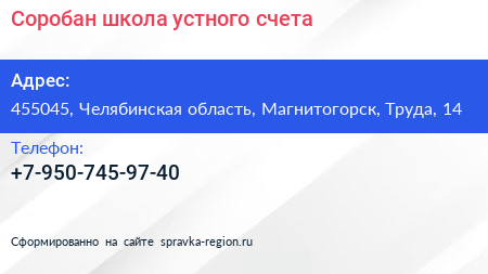 Соробан, школа устного счета по адресу 455045, Челябинская область, Магнитогорск, Труда, 14 в дальнейшем Организация, размещена в следующих категориях: