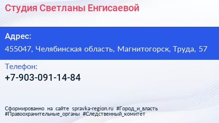 Студия Светланы Енгисаевой по адресу 455047, Челябинская область, Магнитогорск, Труда, 57 в дальнейшем Организация, размещена в следующих категориях: