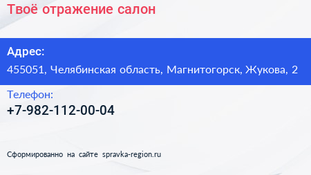 Твоё отражение, салон по адресу 455051, Челябинская область, Магнитогорск, Жукова, 2 в дальнейшем Организация, размещена в следующих категориях: