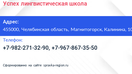 Успех, лингвистическая школа по адресу 455000, Челябинская область, Магнитогорск, Калинина, 10 в дальнейшем Организация, размещена в следующих категориях: