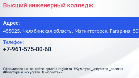 Высший инженерный колледж по адресу 455025, Челябинская область, Магнитогорск, Гагарина, 50 в дальнейшем Организация, размещена в следующих категориях: