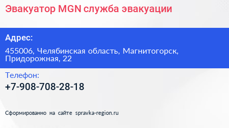 Эвакуатор MGN, служба эвакуации по адресу 455006, Челябинская область, Магнитогорск, Придорожная, 22 в дальнейшем Организация, размещена в следующих категориях: