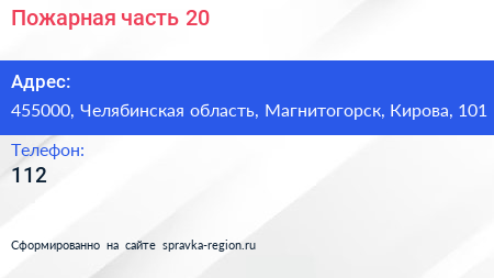 Пожарная часть №20 по адресу 455000, Челябинская область, Магнитогорск, Кирова, 101 в дальнейшем Организация, размещена в следующих категориях: