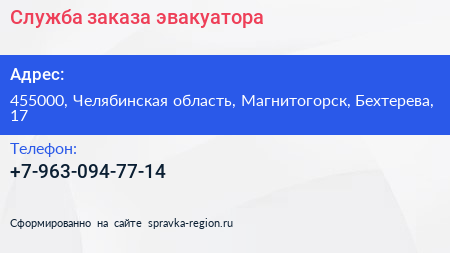 Служба заказа эвакуатора по адресу 455000, Челябинская область, Магнитогорск, Бехтерева, 17 в дальнейшем Организация, размещена в следующих категориях: