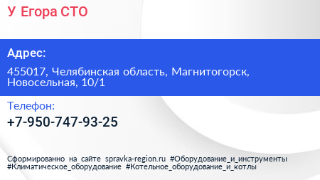 У Егора, СТО по адресу 455017, Челябинская область, Магнитогорск, Новосельная, 10/1 в дальнейшем Организация, размещена в следующих категориях: