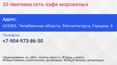 33 пингвина, сеть кафе-мороженых по адресу 455001, Челябинская область, Магнитогорск, Герцена, 6 в дальнейшем Организация, размещена в следующих категориях: