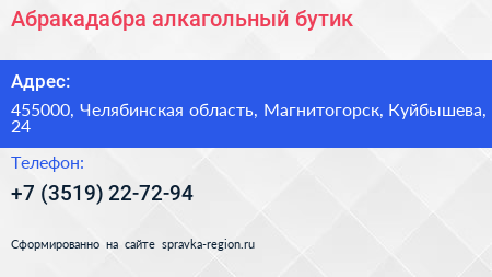 Абракадабра, алкагольный бутик по адресу 455000, Челябинская область, Магнитогорск, Куйбышева, 24 в дальнейшем Организация, размещена в следующих категориях: