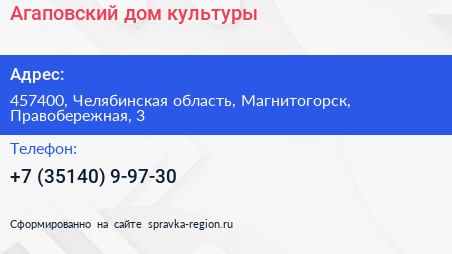 Агаповский дом культуры по адресу 457400, Челябинская область, Магнитогорск, Правобережная, 3 в дальнейшем Организация, размещена в следующих категориях: