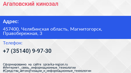 Агаповский, кинозал по адресу 457400, Челябинская область, Магнитогорск, Правобережная, 3 в дальнейшем Организация, размещена в следующих категориях: