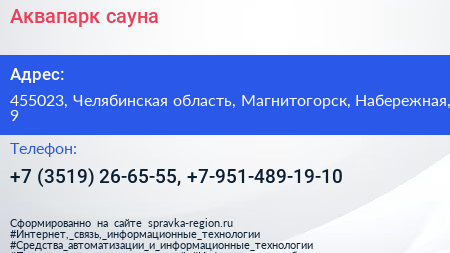 Аквапарк, сауна по адресу 455023, Челябинская область, Магнитогорск, Набережная, 9 в дальнейшем Организация, размещена в следующих категориях: