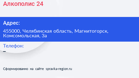 Алкополис 24 по адресу 455000, Челябинская область, Магнитогорск, Комсомольская, 3а в дальнейшем Организация, размещена в следующих категориях: