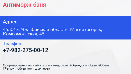 Антиморж, баня по адресу 455017, Челябинская область, Магнитогорск, Комсомольская, 45 в дальнейшем Организация, размещена в следующих категориях: