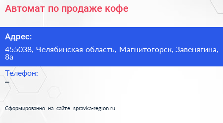 Автомат по продаже кофе по адресу 455038, Челябинская область, Магнитогорск, Завенягина, 8а в дальнейшем Организация, размещена в следующих категориях:
