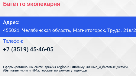 Багетто, экопекарня по адресу 455021, Челябинская область, Магнитогорск, Труда, 21в/2 в дальнейшем Организация, размещена в следующих категориях: