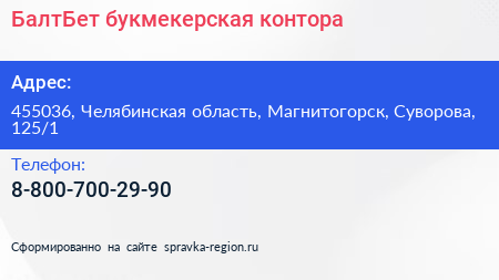 БалтБет, букмекерская контора по адресу 455036, Челябинская область, Магнитогорск, Суворова, 125/1 в дальнейшем Организация, размещена в следующих категориях: