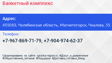 Банкетный комплекс по адресу 455010, Челябинская область, Магнитогорск, Чкалова, 55 в дальнейшем Организация, размещена в следующих категориях: