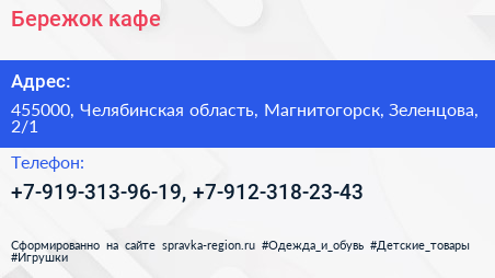 Бережок, кафе по адресу 455000, Челябинская область, Магнитогорск, Зеленцова, 2/1 в дальнейшем Организация, размещена в следующих категориях: