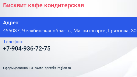 Бисквит, кафе-кондитерская по адресу 455037, Челябинская область, Магнитогорск, Грязнова, 30 в дальнейшем Организация, размещена в следующих категориях: