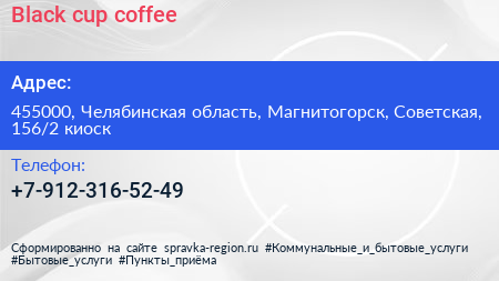 Black cup coffee по адресу 455000, Челябинская область, Магнитогорск, Советская, 156/2 киоск в дальнейшем Организация, размещена в следующих категориях: