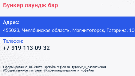 Бункер, лаундж-бар по адресу 455023, Челябинская область, Магнитогорск, Гагарина, 10 в дальнейшем Организация, размещена в следующих категориях: