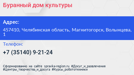Буранный дом культуры по адресу 457410, Челябинская область, Магнитогорск, Волынцева, 1 в дальнейшем Организация, размещена в следующих категориях:
