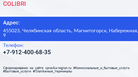 COLIBRI по адресу 455023, Челябинская область, Магнитогорск, Набережная, 9 в дальнейшем Организация, размещена в следующих категориях: