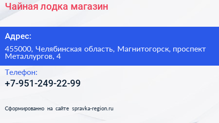 Чайная лодка, магазин по адресу 455000, Челябинская область, Магнитогорск, проспект Металлургов, 4 в дальнейшем Организация, размещена в следующих категориях:
