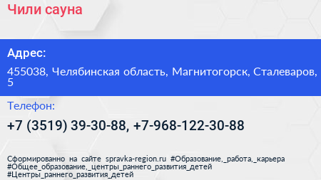 Чили, сауна по адресу 455038, Челябинская область, Магнитогорск, Сталеваров, 5 в дальнейшем Организация, размещена в следующих категориях: