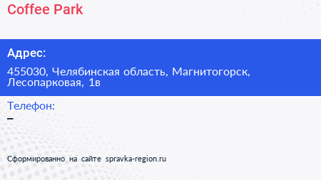 Coffee Park по адресу 455030, Челябинская область, Магнитогорск, Лесопарковая, 1в в дальнейшем Организация, размещена в следующих категориях: