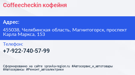 Coffeecheckin, кофейня по адресу 455038, Челябинская область, Магнитогорск, проспект Карла Маркса, 153 в дальнейшем Организация, размещена в следующих категориях: