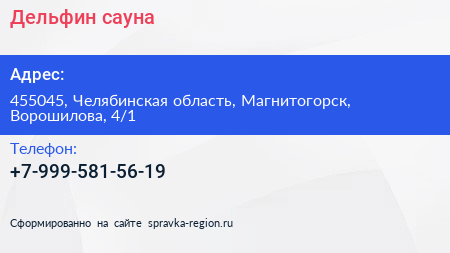 Дельфин, сауна по адресу 455045, Челябинская область, Магнитогорск, Ворошилова, 4/1 в дальнейшем Организация, размещена в следующих категориях: