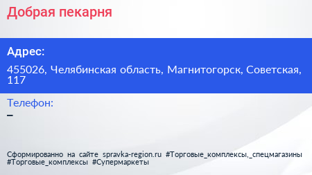 Добрая, пекарня по адресу 455026, Челябинская область, Магнитогорск, Советская, 117 в дальнейшем Организация, размещена в следующих категориях: