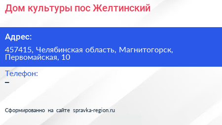 Дом культуры, пос. Желтинский по адресу 457415, Челябинская область, Магнитогорск, Первомайская, 10 в дальнейшем Организация, размещена в следующих категориях: