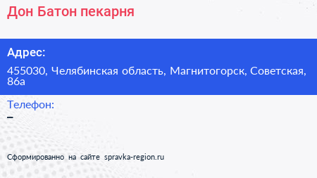 Дон Батон, пекарня по адресу 455030, Челябинская область, Магнитогорск, Советская, 86а в дальнейшем Организация, размещена в следующих категориях: